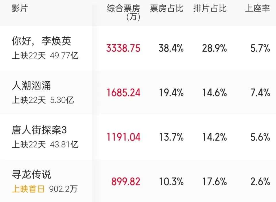 3月5日,迪士尼动画电影《寻龙传说》上映,排片占比17.6%,票房占比却只有10.3%,当天收899.82万元,比不上已上映22天的三部春节档电影,与《你好,李焕英》更是差了三倍。