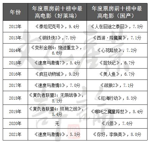 文化产业评论(ID:whcypl)梳理了近十年好莱坞大片在国内的表现,发现其在评分、票房等多个维度均有所衰弱,19年以来更是疲态尽显。
