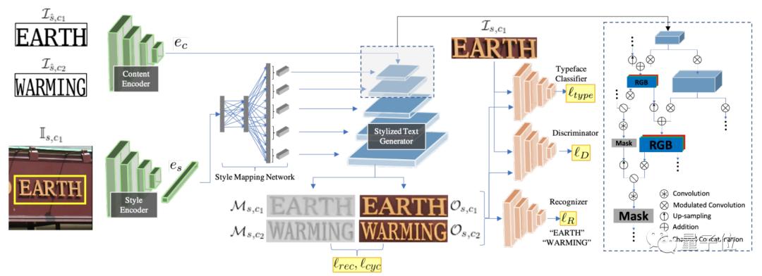 然后,为了进一步更精细地控制文本的风格特征,还会提取神经网络层中的各种风格信息,并将这些信息注入文本生成器中,便于从各种尺度(颜色、整体风格、细节)上控制文字的风格。