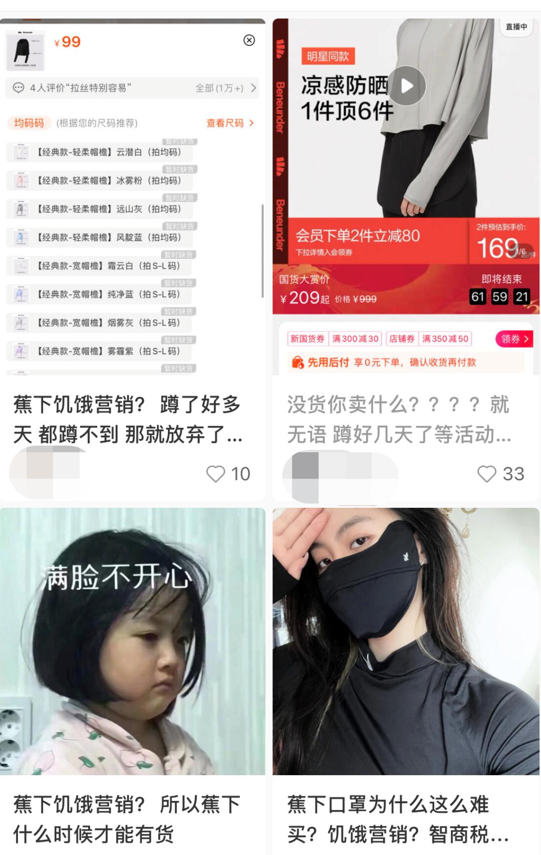 首先是多数网友都提出过的“饥饿营销”质疑。2-3个月出一次新品的蕉下,其新品一直是限时限量抢购,热门产品的热门色号,更是在618购物节之前就已售罄。
