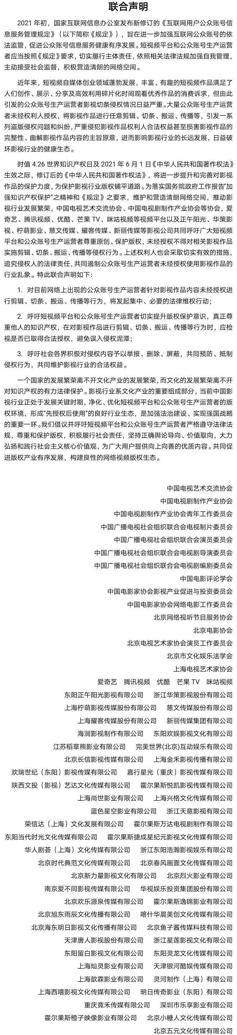 4月9日优爱腾芒联合53家影视公司、15家影视行业协会发布的联合声明