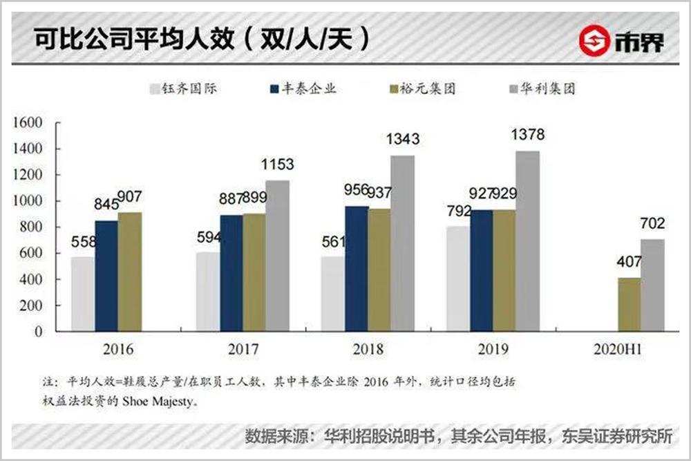 在产量上,华利也在台湾地区一众鞋企中遥遥领先。2019年裕元、钰齐、丰泰人均鞋履产量分别为929双/年、927双/年、792双/年,而华利则达到1378双/年。