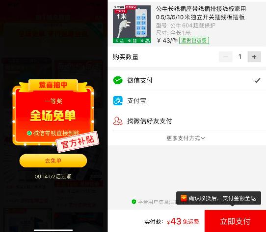 最终,小八选购了一个价值43元包邮的公牛插座,下单前,支付界面明确写着“确认收货后,支付金额全返”。不过,下单后拼多多的提示,让同样作为一个科技记者的小八觉得自己受到了伤害。