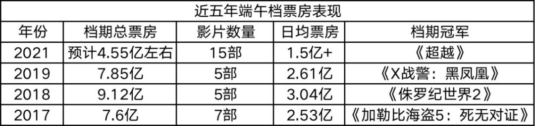 之所以出现这种情况,主要还是由于头部项目的缺席。根据往年市场状况,端午档几乎是好莱坞大片的必选档期。有了头部项目的支撑,中小体量国产新片往往会主动避让,即便新片数量有限,往年端午档大盘仍然可以稳定在7亿元以上。