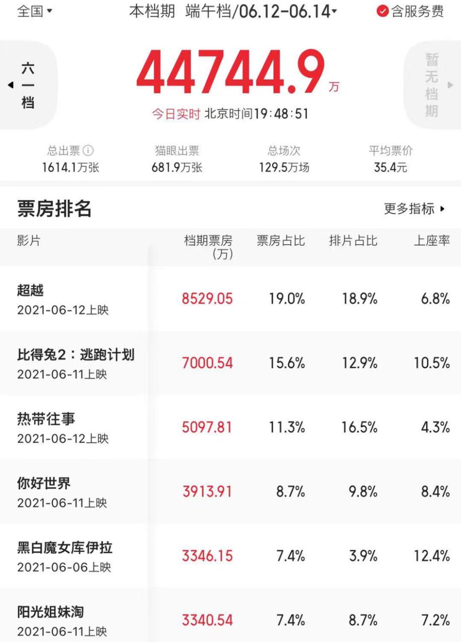 最终从这场混战中脱颖而出的《超越》,虽夺得了档期票房冠军席位,其优势也十分微小,仅领先第二名《比得兔2:逃跑计划》票房1500万+。