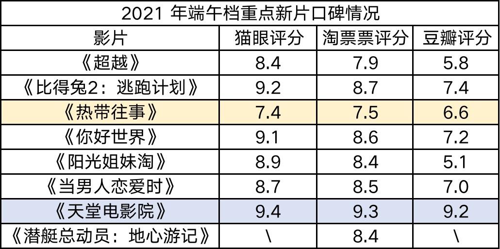 在口碑方面,可以看到,今年端午档引进电影口碑普遍高于国产电影。其中,《比得兔2:逃跑计划》《你好世界》《天堂电影院》三部猫淘评分破9的影片均为引进电影,台湾口碑之作《当男人恋爱时》也在猫淘豆瓣三个平台获得了8.7、8.5、7.0的不错评分。