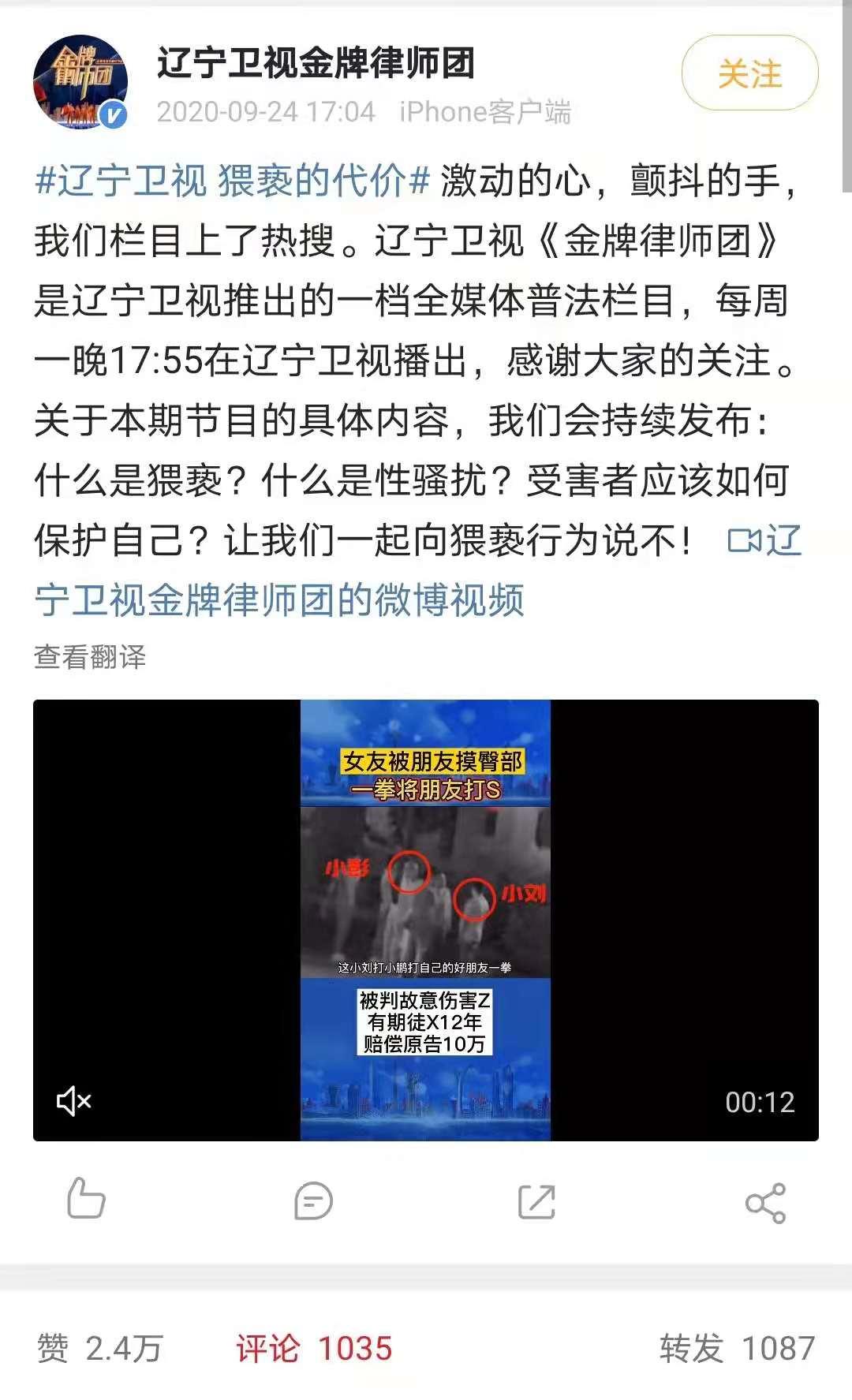 虽然赵本山和辽宁卫视的缘分似乎已淡去,但女权的烙印却依然健在:去年,一档叫“猥亵的代价”的法制节目(栏目为《金牌律师团》)再次登上微博热搜,原因就在于节目充分捍卫了女性权益,号召遇到职场性骚扰的女性大胆说不。