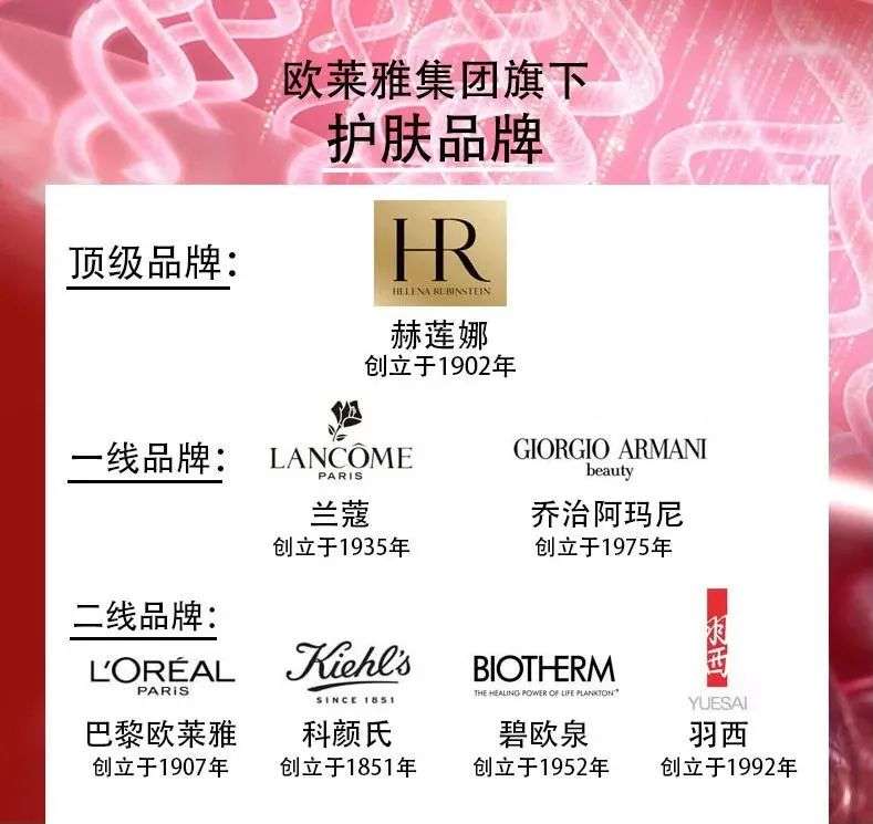 比如巴黎欧莱雅背靠的欧莱雅集团,旗下有顶级品牌赫莲娜、阿玛尼,一线品牌兰蔻,二线品牌植村秀、羽西;雅诗兰黛集团,旗下顶级品牌La Mer,一线品牌雅诗兰黛、二线品牌倩碧、悦木之源;LVMH集团,旗下有娇兰、迪奥、纪梵希……