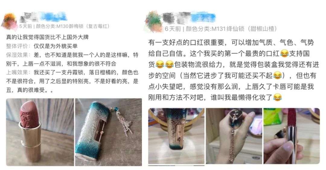 再一搜买家评价,7万+的销量在国货彩妆里表现算很不错,但比起对外壳和雕花设计的一致赞美,人们对口红本身的评价褒贬不一,有的人还算满意,也有相当一部分人提到口红太干有卡唇现象、质感一般等问题。