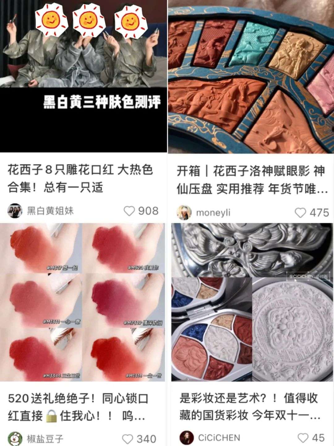 小红书一堆“花西子全线测评”、“花西子口红/眼影试色”、“花西子,种草or踩雷?”,经常刷着刷着就看到,高频出现总有一个让你好奇想点进去看看。