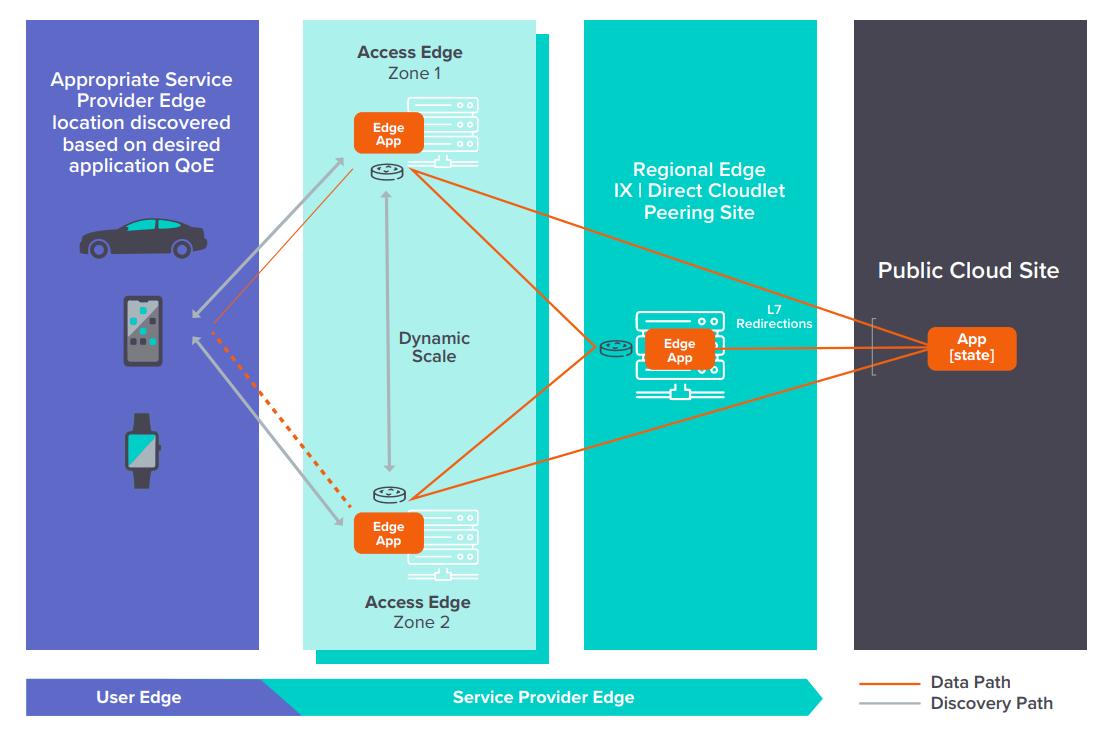 服务提供商边缘的实施需要综合考虑延迟、带宽、隐私等用户需求,涉及到不同的部署类型。上图提供了一种服务提供商边缘的部署实例,在这个例子中,应用方案不仅跨越了多个服务提供商网络,还与公有云合作提供整合服务。