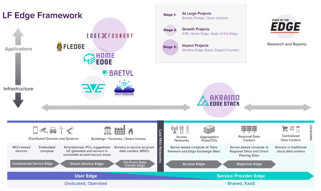 Linux基金会成立的LF边缘小组,负责组织和建立用于边缘计算的开源框架。目前LF边缘计算架构日趋成熟,其中的开源项目项目几乎涵盖边缘计算生态系统的所有元素,关键项目包括Akraino Edge Stack、EdgeX Foundry和Project EVE等。