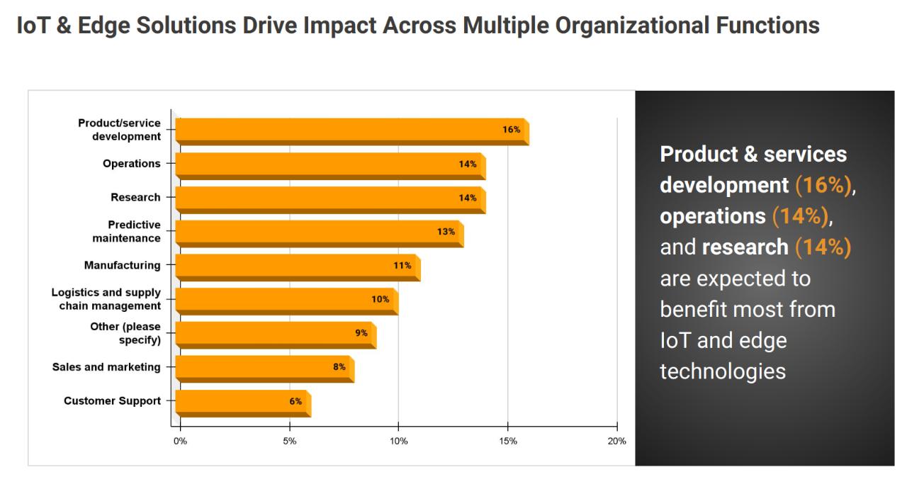 物联网和边缘计算对企业各个部门的影响是深远的,产品和服务开发(16%)、运营(14%)和研发(14%)预计将从其中受益最大。