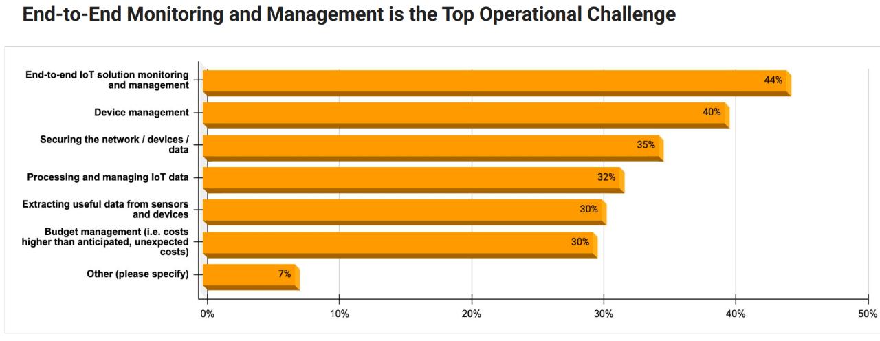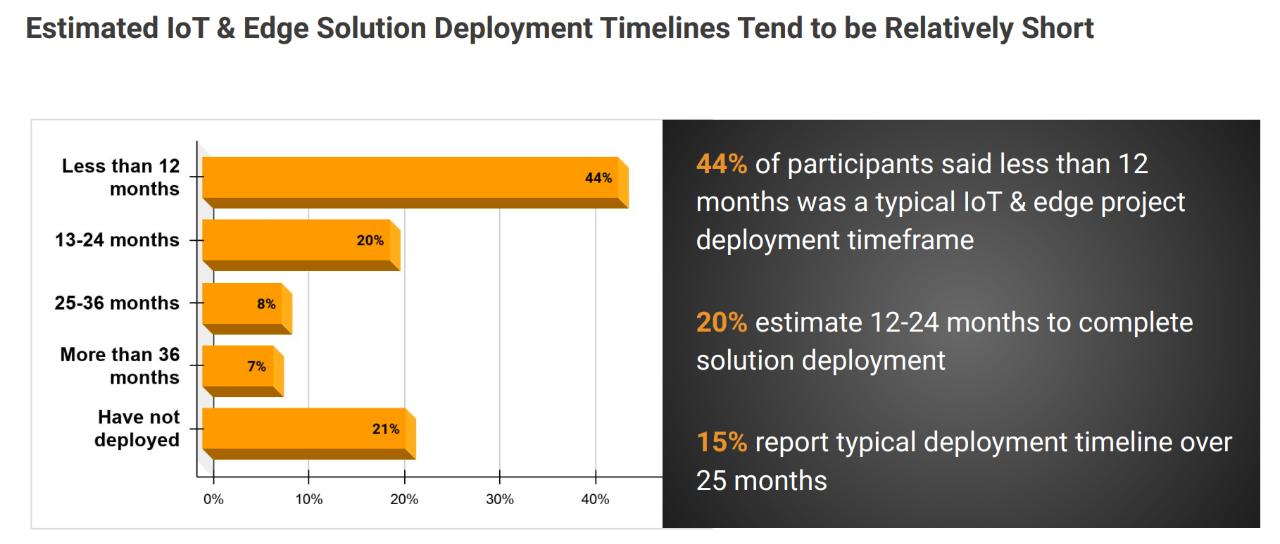 44%的受访者表示,典型的物联网和边缘项目部署时间不到12个月。20%的受访者经历了12-24个月才能完成解决方案部署。还有15%的受访者报告他们的部署时间超过25个月,更有7%甚至超过36个月。