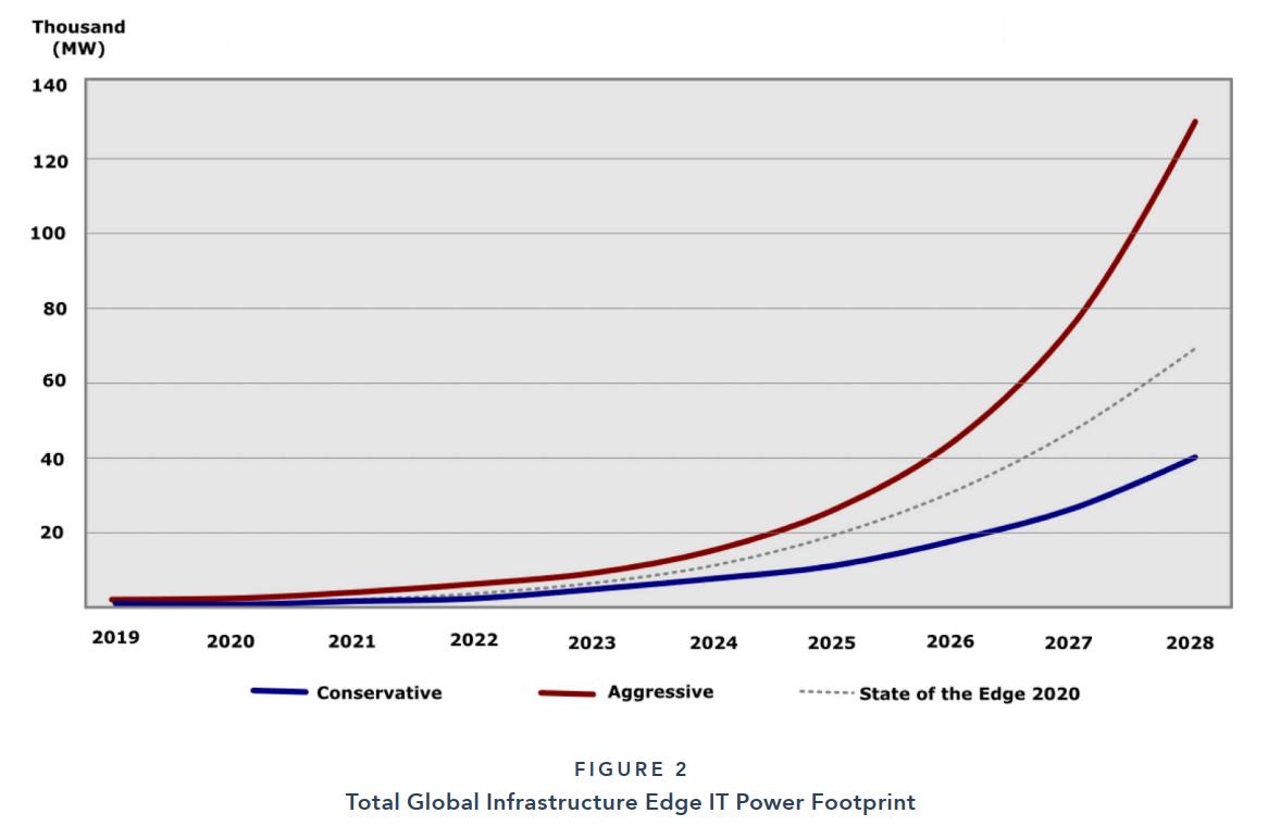 由此,研究报告给出了边缘计算的发展预期。由于过去一年的不确定性增强,2021年的报告在2020年的基础上,增加了预测的上下阈值。
