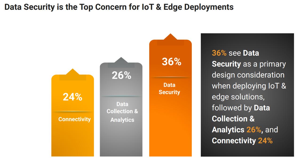 数据安全是物联网和边缘部署的首要问题,36%的企业将数据安全视为部署物联网和边缘解决方案时主要的考虑因素。其次是数据收集和分析占比26%,以及连接性,占比24%。
