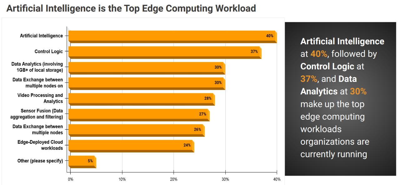 在边缘计算的应用过程中,人工智能占据了最大的“人工”。按照工作量划分,人工智能占40%,其次是控制逻辑占37%和数据分析占30%。