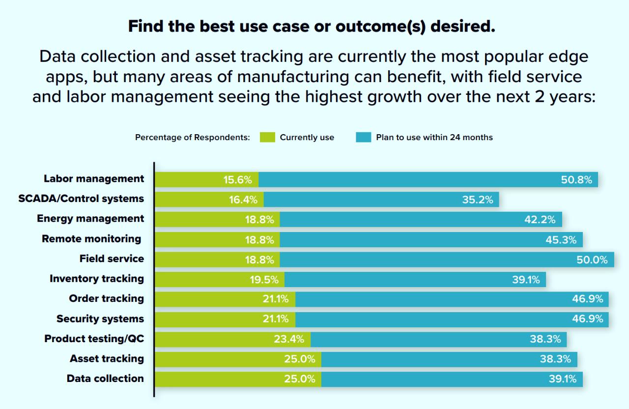 实施边缘计算项目具有明确的预期收益,虽然数据采集和资产追踪是目前使用最为广泛的边缘应用程序,但是制造业的很多领域都可以随之受益,比如更好的人员管理、质量更优的现场服务,以及更有效率的能源管理。