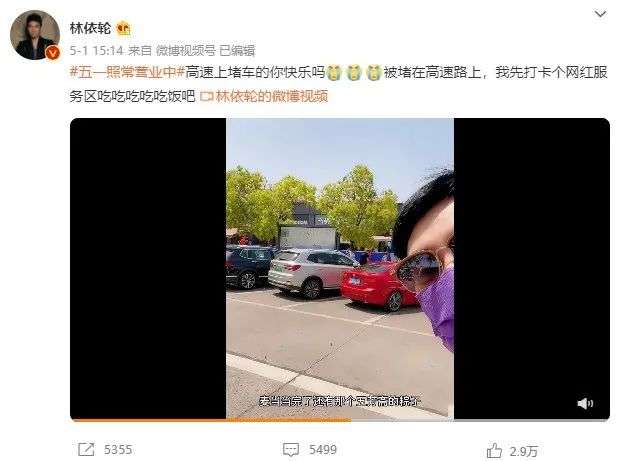 上个月五一假期,歌手林依伦被堵在嘉兴服务区,索性开始逛吃逛吃,他发布的微博迅速冲上热搜。