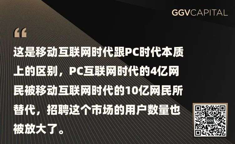 这是移动互联网时代跟PC时代本质上的区别,PC互联网时代的4亿网民被移动互联网时代的10亿网民所替代,招聘这个市场的用户数量也被放大了。
