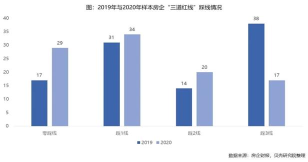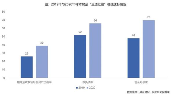 但是,这可能是操作的结果。现金短债比最容易达标,2020年达标率高达70%,也是房企降档的首要武器,较2019年达标率提升22个百分点。净负债率达标率66%,较2019年提升14个百分点。剔除预收款项后的资产负债率达标情况较2019年有明显提升,但仍未超过40%的达标率。