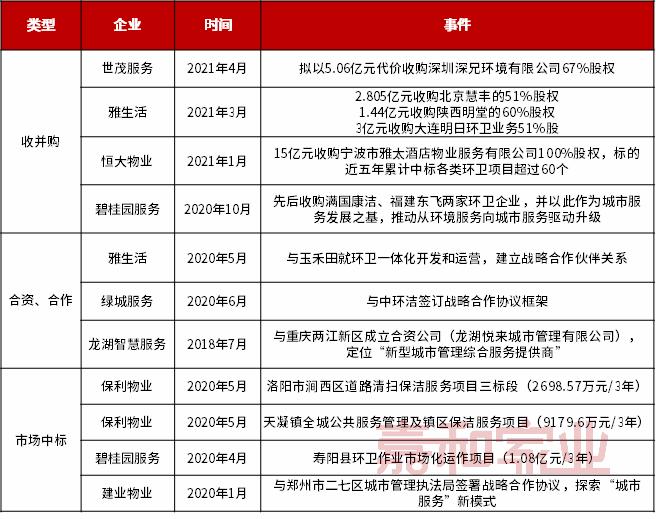 2021年3月22日,雅生活服务宣布:分别以2.805亿元收购北京慧丰51%股权、1.44亿元收购陕西明堂60%股权及3亿元收购大连明日环卫业务51%股权,总代价7.245亿元。同时公告出,雅生活拟以1.53亿元收购安徽宇润51%股权。此外,雅生活亦通过股权收购及认购增发股权方式收购中航环卫合共30%股权,总代价为人民币3亿元。标的均在环卫领域及城市公共服务领域拥有较强的服务专业度,项目续约率均在90%及以上。