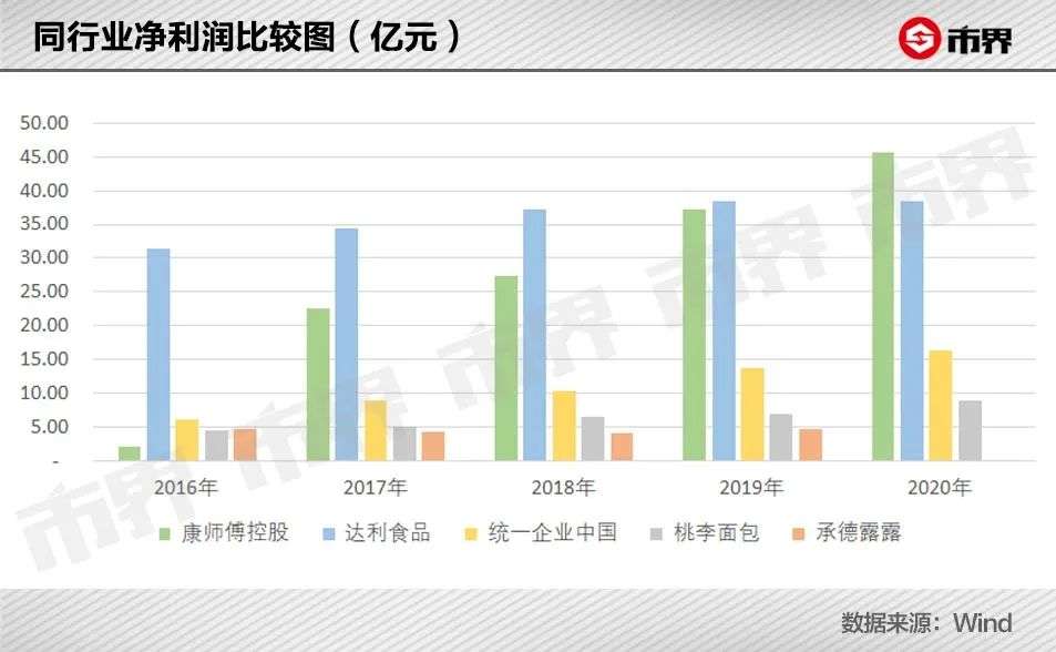 从近几年几家食品企业的净利润来看,达利食品在2016年以前以绝对优势大幅领先友商,2017年开始,差距已经在逐渐缩小,2020年甚至被康师傅反超。