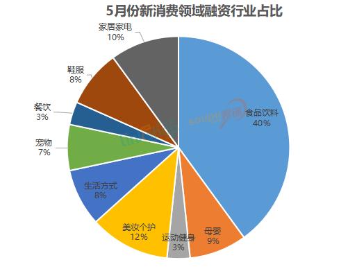 食品赛道依然是最受资本关注的赛道,同样也聚集了最多的玩家。5月,食品饮料领域发生24起融资事件,占比为40%;美妆个护领域发生7起融资事件,占比为12%。紧随其后的是家居家电、母婴、鞋服、生活方式、宠物等领域。