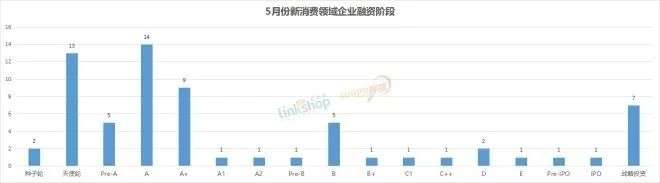 从融资轮次来看,5月份新消费品牌融资主要集中在A轮、天使轮阶段,A轮融资品牌数量达到14起,天使轮融资品牌数量达到13起。虽然这些轮次的融资占比仍然较大,但与4月相比,A轮以后阶段的融资数量占比进一步上升。