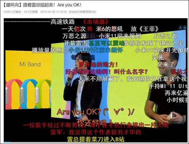 2015年雷军在印度发表小米手环发布会上,雷式英语“Are you OK”迅速被鬼畜区UP主们采用当作素材,魔性的旋律红遍整个B站,点击量突破3700万,被评为年度最佳洗脑神曲。雷军无形中成功破圈,塑造“歌手”这一全新人设,知名度和好感度大增。
