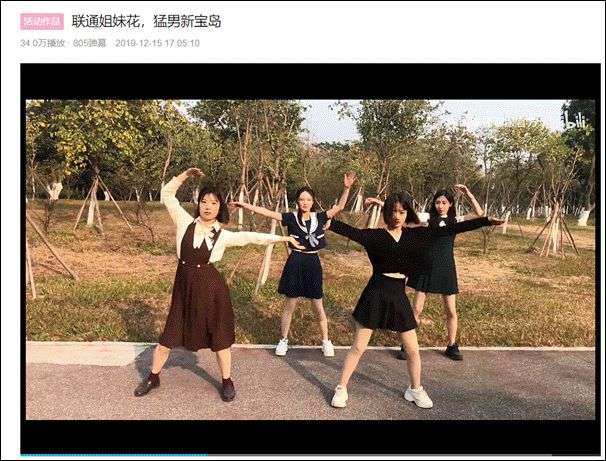 2019年12月15日,中国联通发布视频作品《联通姐妹花,猛男新宝岛》后一炮打红,收获34万播放量。