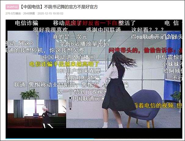 中国电信在2020年12月发布的“书记舞”,在B站观看量达276万。
