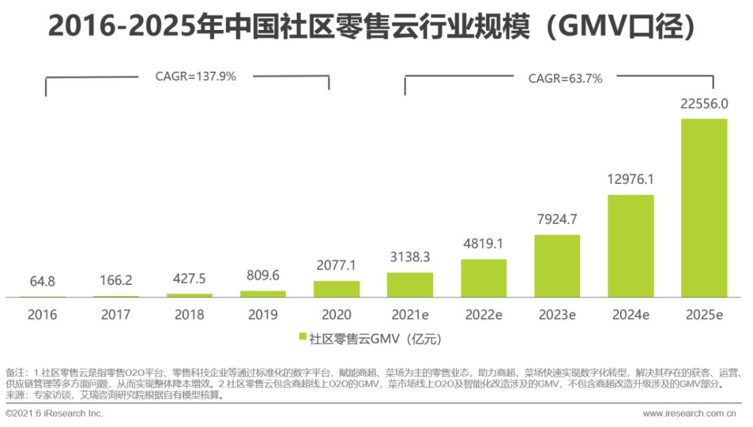 艾瑞测算,社区零售云2020年GMV达到2077亿元,2025年社区零售云GMV预计将超过2.2万亿。社区零售云快速增长受益于以下三个方面:1)在头部零售商的带动下,零售云在数量众多的中小零售商市场快速覆盖;2)零售云通过赋能低线城市零售终端触达消费者,从而拉动GMV快速增长;3)零售云模式会帮助商超、社区便利店、菜场等零售业态有效实现数字化转型升级。