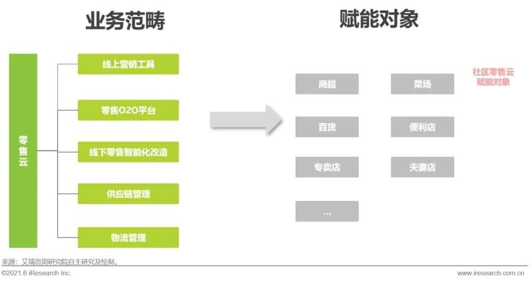 零售云:是指零售 O2O平台、零售科技企业等通过标准化的数字平台,赋能零售业态(便利店、商超、百货、菜场等零售终端)来快速实现数字化转型,解决线下零售业态存在的获客、运营、供应链管理等多方面问题,从而实现整体降本增效。