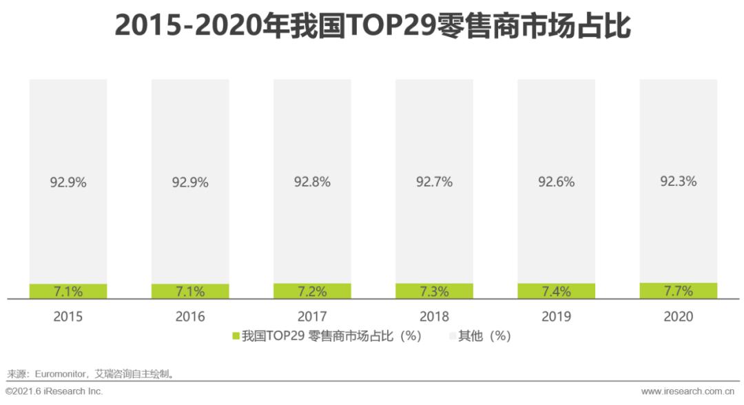 我国地理空间大,不同地区生活消费习惯差异化明显,这使得线下零售行业很难出现大规模零售企业。整体行业呈现参与企业数量多,行业整体市场集中度低,长尾效应明显的特征。而受网络零售等因素影响,传统零售商的自身盈利能力减弱,社区零售市场增速进一步放缓,线下零售行业需要新的增长途径驱动线下零售行业发展。