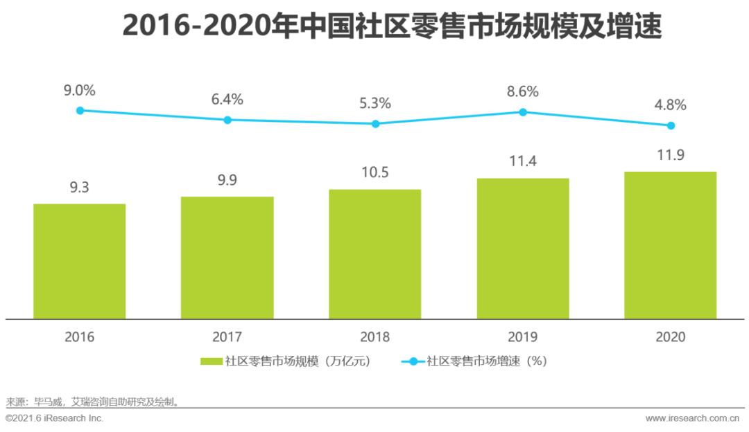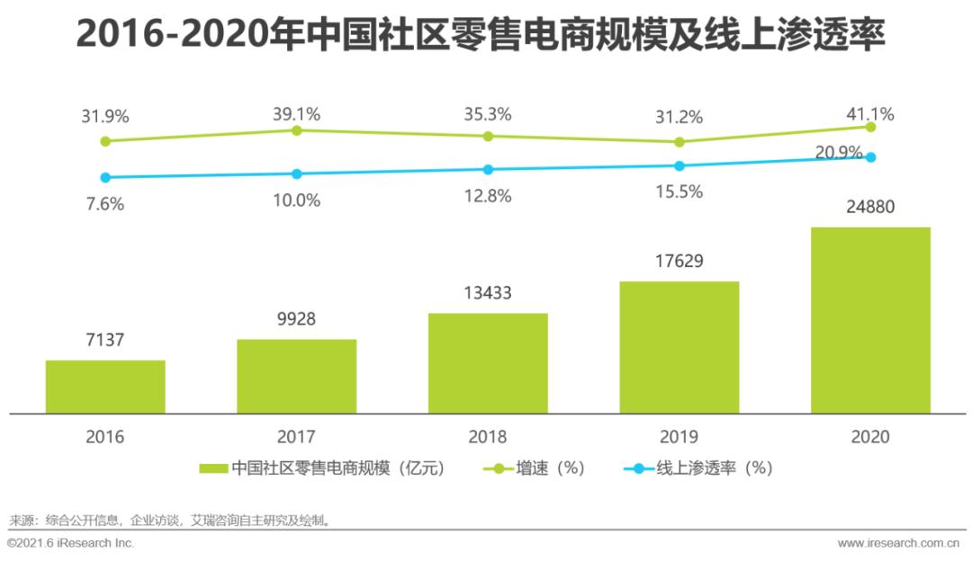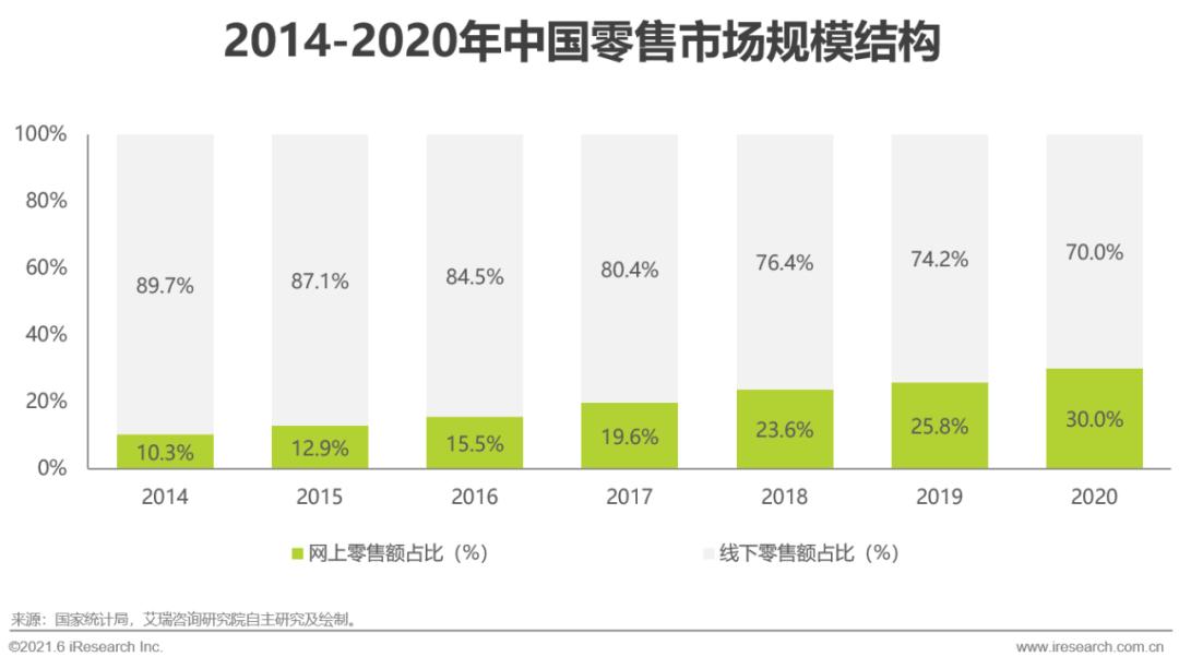 根据国家统计局数据显示,2020年我国网上零售额占比达到30%,线下零售额由2014年的89.7%持续下降至2020年的70%,线下零售业态整体承压。社区零售电商规模由2016年的7137.1亿元扩增至2020年的24880.4亿元,线上渗透率由2016年的7.6%提高至2020年的20.9%。网购打破了消费者购物的时间和地理的限制,为消费者零时差购物提供了更为便利的渠道,传统零售业态以地理位置换取流量的方式逐渐无法满足消费者的购物需求。因此,线下零售行业整体呈现逐步向线上转移的发展趋势。
