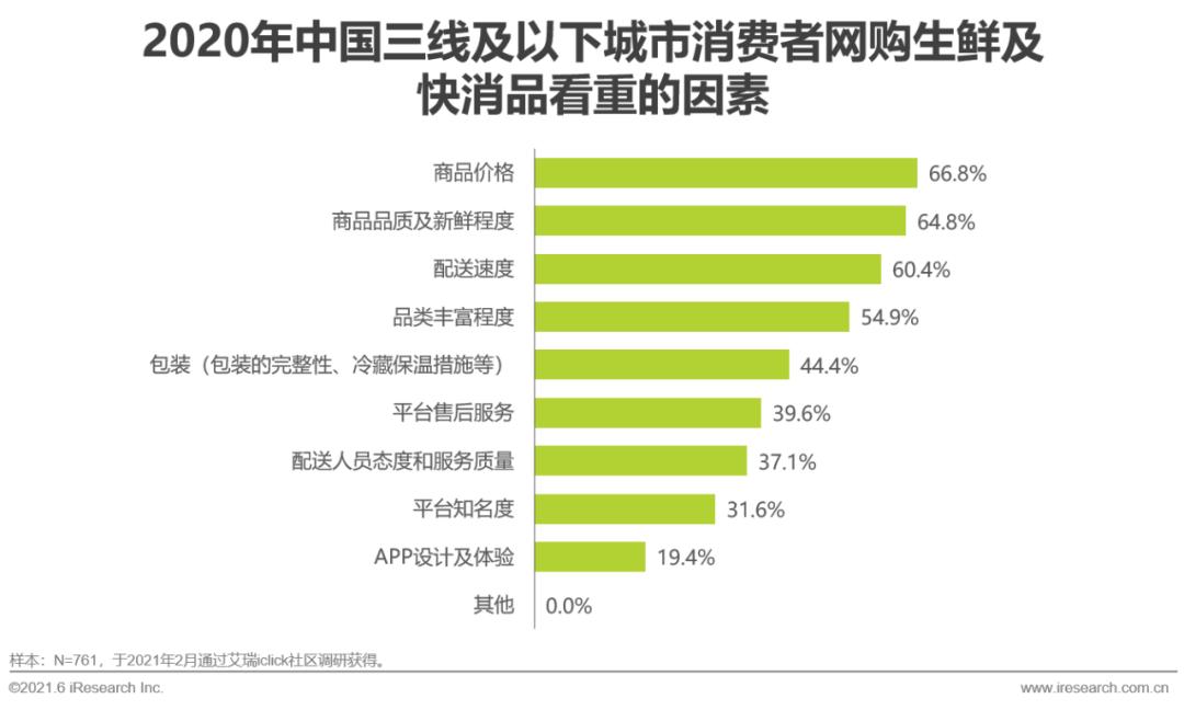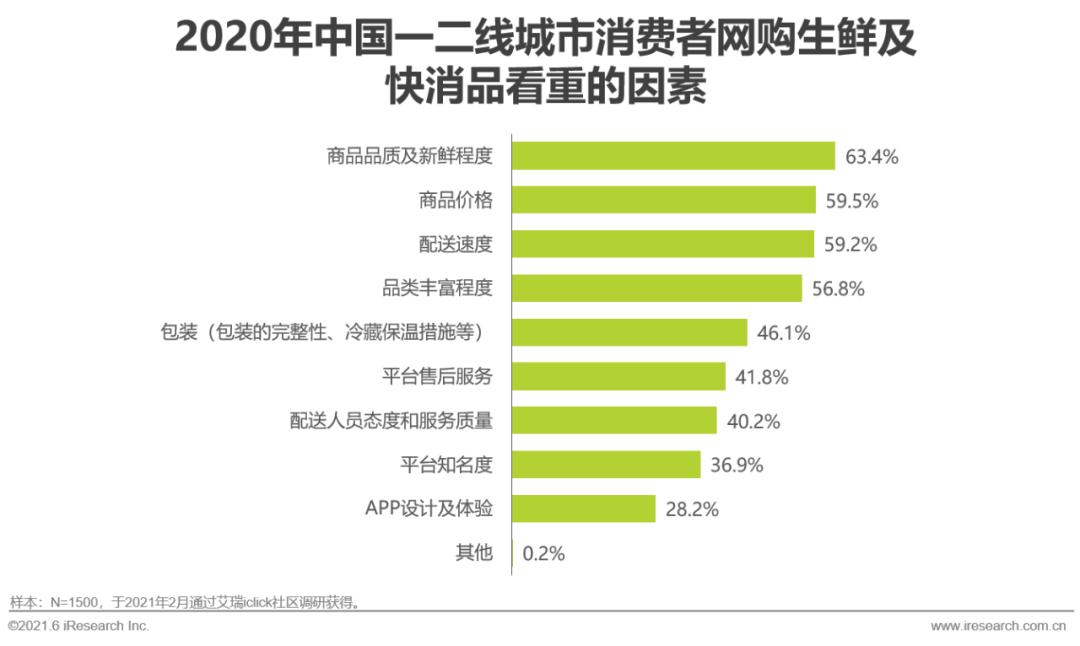 对于消费者而言,更好更快地购买到自身所想要的商品是消费者购物的目标,消费者会优先选择可以满足其消费需求的零售渠道。从整体来看,消费者所关注的因素前三名都是商品品质及新鲜程度、商品价格和配送速度。足以说明,我国消费者对于更快更好的消费体验的需求增强,消费主义意识兴起并进一步强化,消费升级趋势明显。