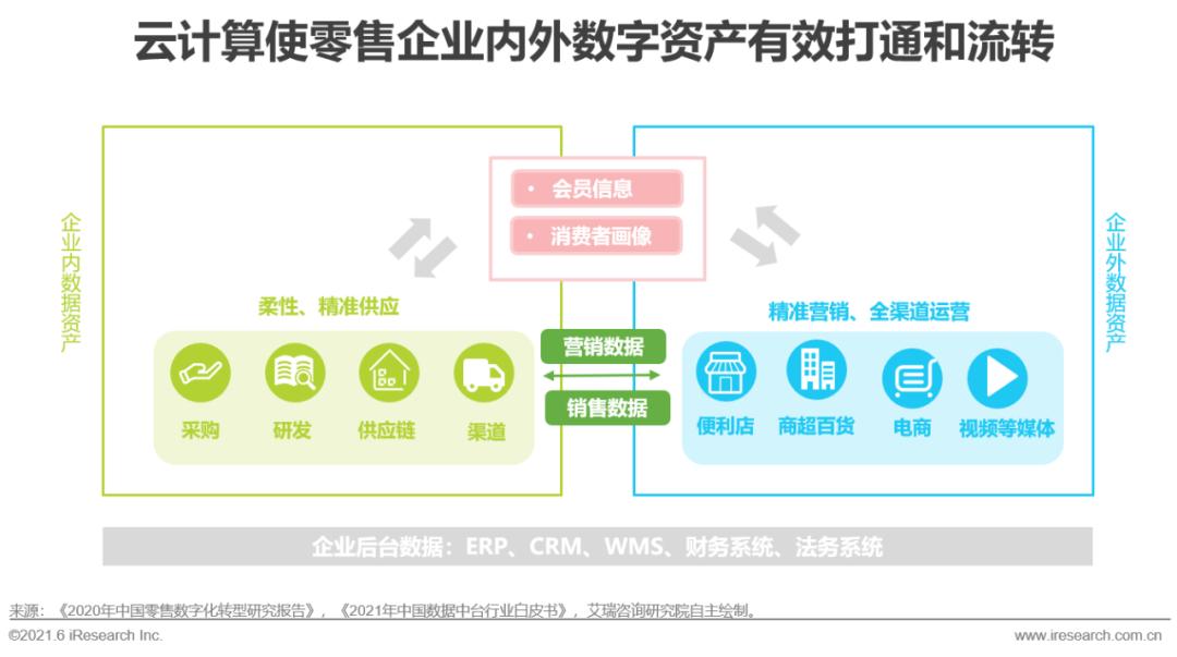 20世纪90年代,随着POS机等信息采集终端以及企业服务类软件在零售行业中推广开来,零售行业信息化进程拉开序幕。随着网络零售对线下零售的冲击以及流量红利的持续减弱,互联网企业和传统零售商都意识到如何有效触达、掌握并转化消费者是零售业的发展趋势。由于零售企业商品SKU丰富、消费者消费场景变化快、订单量大且碎片化程度高等特点,使得以云计算为核心的零售云模式成为有效串联企业内外数据资产,深入挖掘数字价值的有效途径。