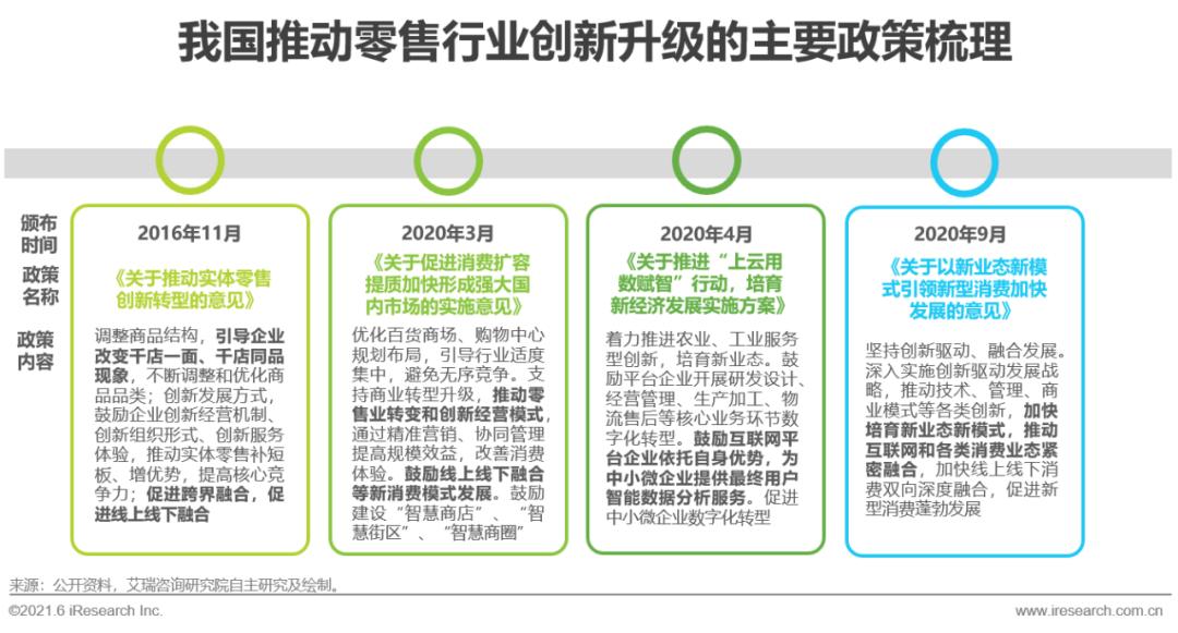 自2016年开始,国家出台系列政策引导实体零售行业进行转型升级,2016年国务院发布《关于推动实体零售创新转型的意见》,其中“创新发展方式,鼓励企业创新经营机制、创新组织形式、创新服务体验,推动实体零售补短板、增优势,提高核心竞争力”为零售行业创新升级提供参考方向。受疫情影响,零售行业受到新的挑战,国家为恢复零售行业发展发布《关于促进消费扩容提质加快形成强大国内市场的实施意见》,鼓励建设“智慧商店“、“智慧街区“、“智慧商圈“。