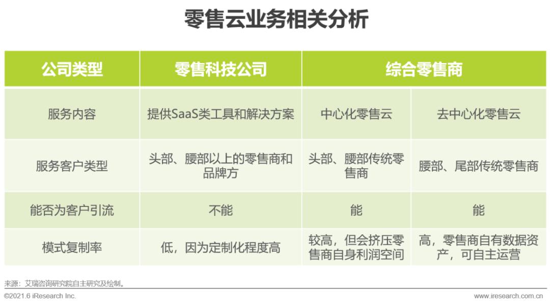 随着全渠道零售不断兴起,零售商认识到线下与线上场景打通的重要价值,除此以外,通过对线下进行数字化赋能来获得线下消费场景下的数字资产从而更好的运营线下业态也得到了零售商的认可。在此背景下,零售科技公司基于自身技术能力为零售商、品牌商提供智慧化的营销SaaS工具和解决方案,从而提高潜客转化、客户留存和客户复购率;线上零售商从自身电商零售运营经验、流量入口和自身技术优势出发,为零售商提供零售云解决方案和线下门店数字化升级;线下零售商基于自身供应链管理运营能力、选品优势以及自身品牌地位,为零售商提供零售云,并对终端零售商进行数字化改造。在这其中,零售云作为未来零售行业的数字化基础设施,目前中心化和去中心化两种模式并存。