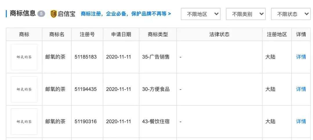资料显示,“邮氧的茶”运营主体为福建省邮氧的茶餐饮管理有限公司,成立于2020年10月,注册资本为1000万人民币。同年11月,中邮恒泰药业有限公司就已经申请注册了“邮氧的茶”商标,而该公司最大股东中邮资本正是由中国邮政集团全资控股。由此可见,开奶茶店,中国邮政已酝酿许久。目前中国共有32.42万家奶茶相关企业,近几年来,奶茶相关企业注册量飞速增长,2020年新注册企业8.54万家,同比增长33%,今年前4月新增企业2.84万家,同比增长60%。在这样的形式下,邮政入局奶茶市场绝非偶然。