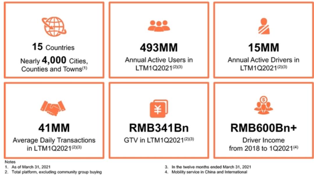 招股书显示,截至2021年3月31日的12个月里,滴滴全球年活跃用户为4.93亿,全球年活跃司机1500万。021年第一季度,滴滴中国出行拥有1.56亿月活用户,同期,Uber的月活跃消费者仅有9800万。