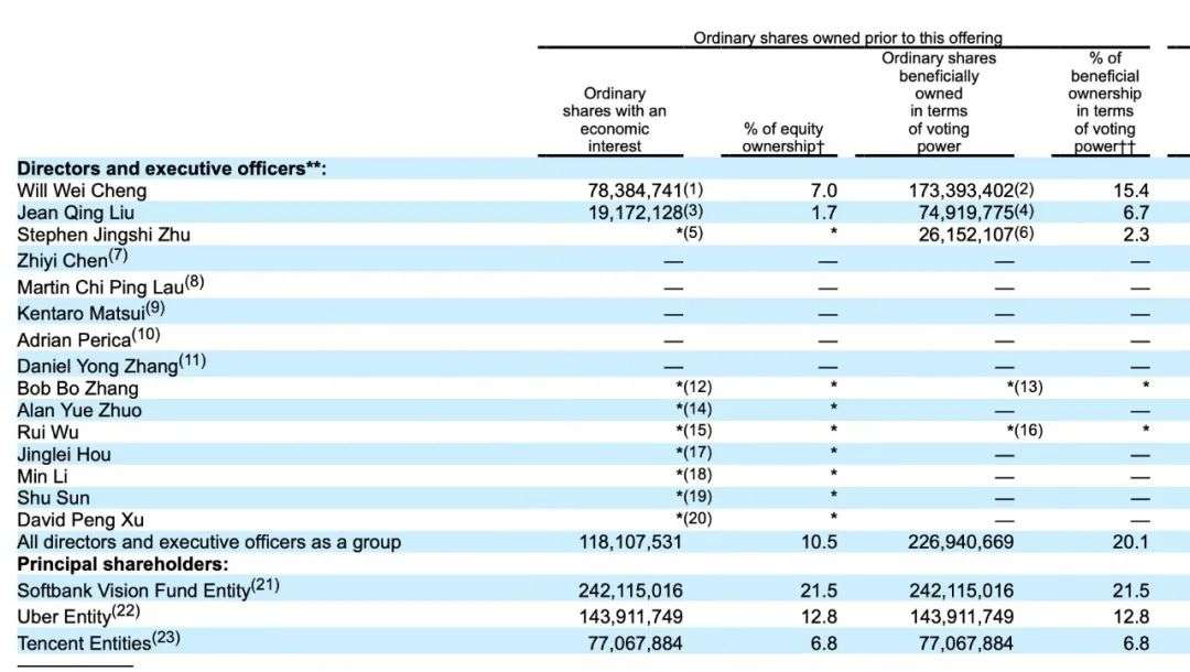 回看滴滴,招股书显示,最大股东软银委派的董事会成员Kentaro Matsui将在滴滴上市时辞任董事,这意味着软银将退出滴滴董事会。而滴滴所有董事和高级管理人员持股比例合计10.5%,投票权为20.1%。其中,滴滴创始人、董事长兼CEO程维持有滴滴7%的股权,15.4%的投票权。滴滴联合创始人、总裁柳青持股1.7%,投票权为6.7%。高级副总裁朱景士持股比例低于1%,投票权为2.3%。