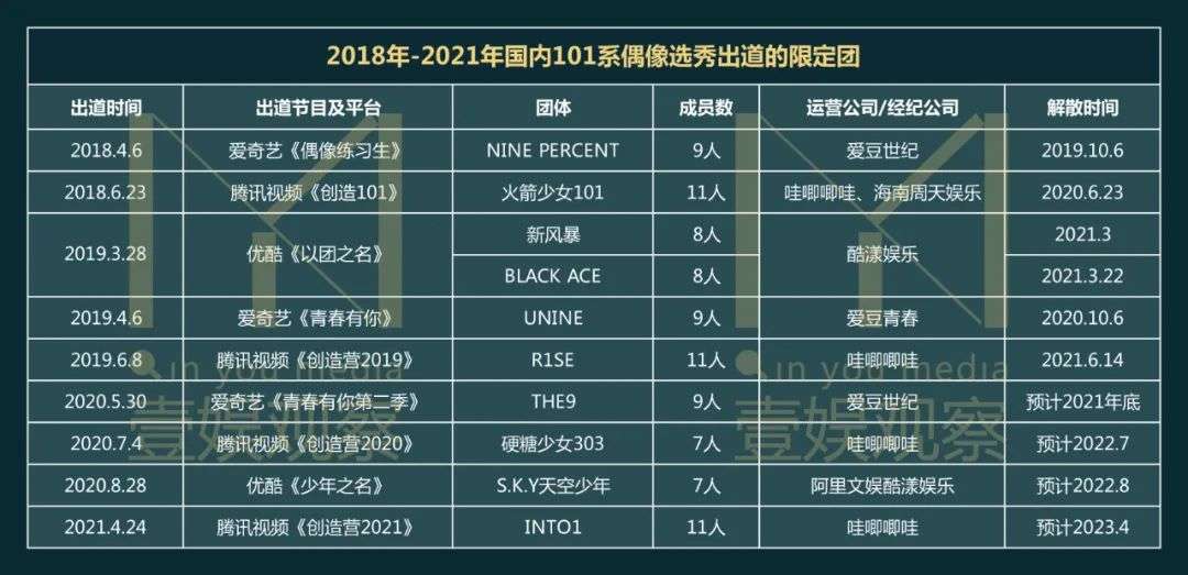 不过,由于接下来的101系偶像选秀全面进入严管阶段,未来方向如何仍旧迷雾重重。即使如此,观众和饭圈还是在不断加强对于此类节目的质疑。而作为此类节目的产品,限定团囿于时间的限制、内娱偶像市场的不完善、运营方与原生经纪公司的意见走向等因素,同样可能会走向完结。