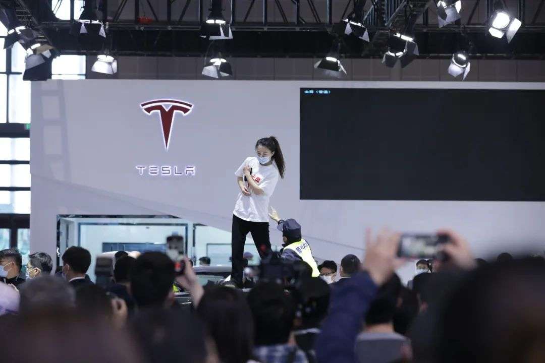4月19日,上海车展开幕日,一位女车主身穿印有“刹车失灵”字样的T恤跳上了特斯拉车顶,高喊“特斯拉刹车失灵”,现场维权。随后这位女车主被现场工作人员制止并抬走。