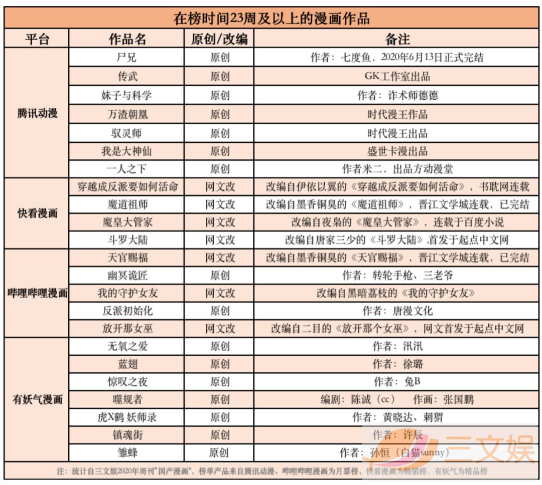根据三文娱整理的2020年腾讯动漫、快看漫画、哔哩哔哩漫画和有妖气四个漫画平台近46周的月票/畅销/精品榜Top10作品数据可知,在榜23周及以上的漫画作品中,快看漫画仅有4部,并且一半为老作品。