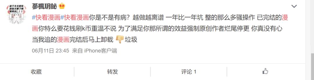 此外,快看漫画近两年来的用户口碑也有所下滑。根据锌财经报道,由于平台缩短作品免费阅读内容,导致部分优秀原创作品因为流量不够而被迫下线。部分网友也在社交媒体上表示抱怨“为了满足所谓的效益让原创作者停更,快看漫画没有心”。