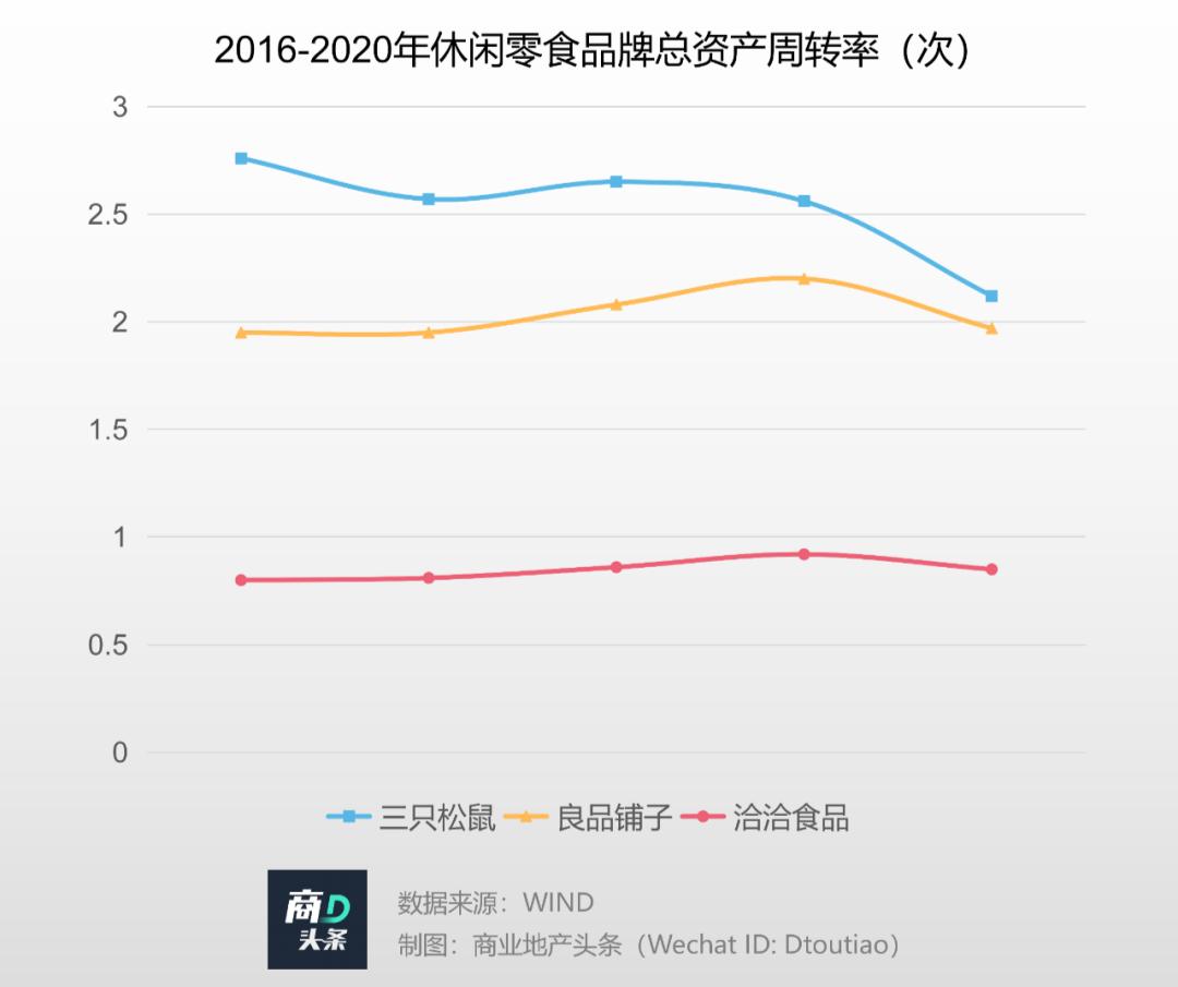 对比销售净利率,洽洽食品远高于三只松鼠和良品铺子。洽洽食品2020年销售净利率接近16%,而三只松鼠和良品铺子均为超过6%;资产周转率上,三只松鼠总资产周转率高点时接近3次/年,良品铺子也有2次/年,而洽洽食品则不足1次/年。
