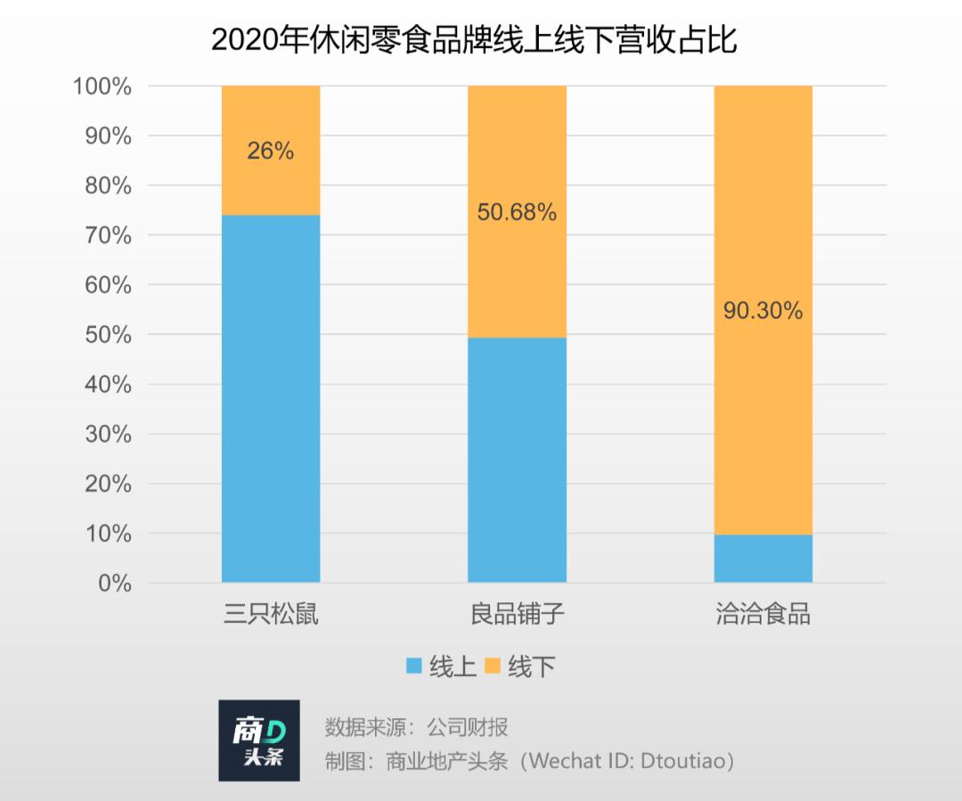 2020年,三只松鼠线上营收占比达74%,洽洽食品线下营收占比超过九成,而良品铺子线上线下较均衡,几乎是各占一半。