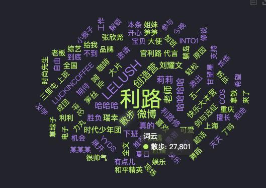 根据时趣洞察引擎对「利路修」的社交平台内容监测分析,内容高频词云中,可以看出「下班」、「笋丝」、「散步」、「营业」、「自由」等标签的关注度显著。